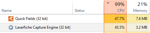 I am running RIO 10.2 with Quick Fields server and agent. QF and the capture engine always run high at 100% even with nothing scheduled at the time. I upgraded from 10.1 to 10.2 with the hotfix that was suppose to fix it. Has anyone experienced this or have an idea on resolving?