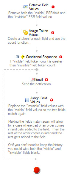 In your case, when the receiving department adds to the PSR field, the workflow would see that the "invisible" one is empty and know that that field changed. This would stop an email notification from going out if any other field was changed. Say for example the company name was spelled wrong and someone changed it. Or deleted a date and added a new date back in.