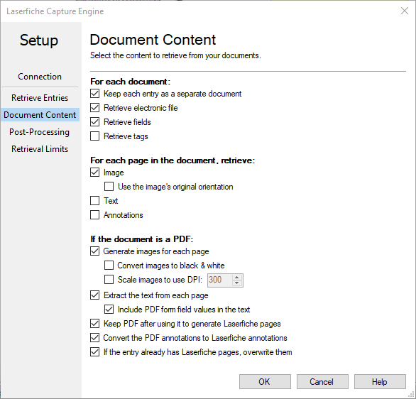I've attached a set of LFCE > Document Content options that can scan in electronic document with fields. They are the default options + "If the entry already has Laserfiche pages, overwrite them". You may have to use a variation if you also need to capture image or text from the document. Let me know if this works or if your configuration is more complicated