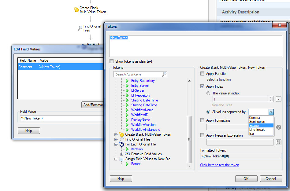 Once you have it finding all the files you need values from, make your first token multi-value.  Then when you assign it to a field on the new file, you just need to use the Apply Index in the token dialog box and separate the values with a space or comma or something.  That put all the values from the token on 1 line.