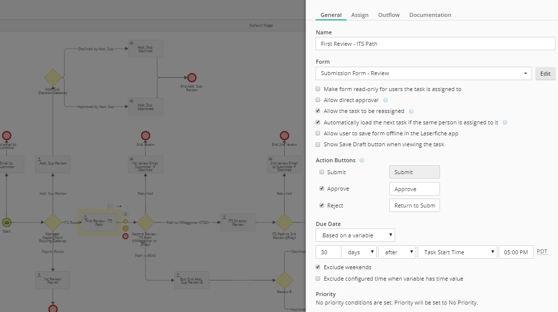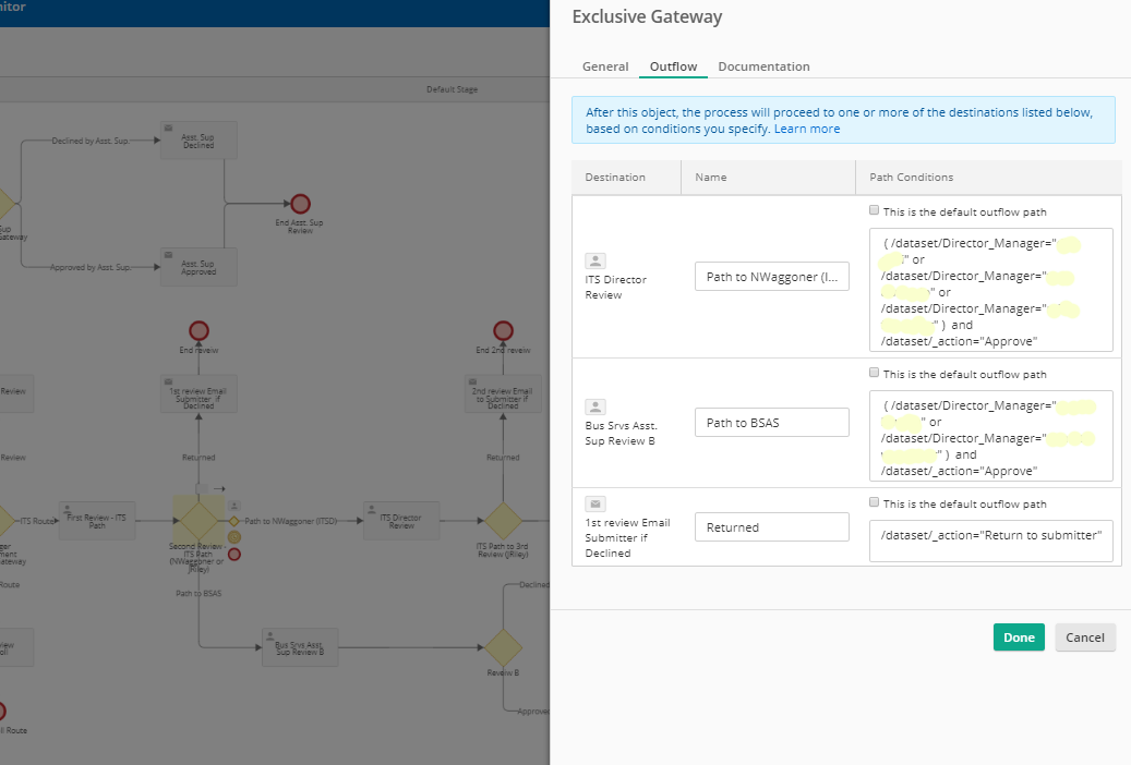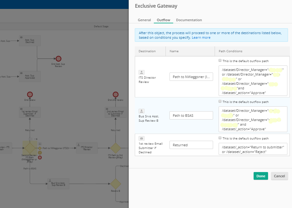 Using an exclusive gateway with Approve and 'Return to Submitter' button for processing. Neither button works on the first stop so the form cannot move through the process.