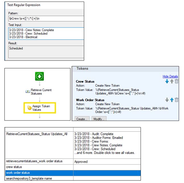 I'm running into an issue where tokens I'm creating via pattern matching aren't getting created in the workflow. When I test out the pattern in the expression it works just fine, however after I run the workflow neither of the tokens is getting populated. The Assign Token Values is right after the Retrieve Values activity, so I'm not entirely sure what's going wrong.