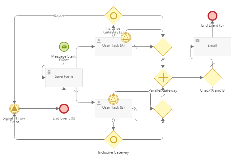 Recently we started incorporating Signal Throw Events to interrupt ongoing processes in Forms. Our goal was to have, let's say for simplicity purposes, two user tasks that ran parallel and a parallel Gateway that waited for them. The Signal Throw Event happens when a form is rejected by either user. Let's call them User A and User B