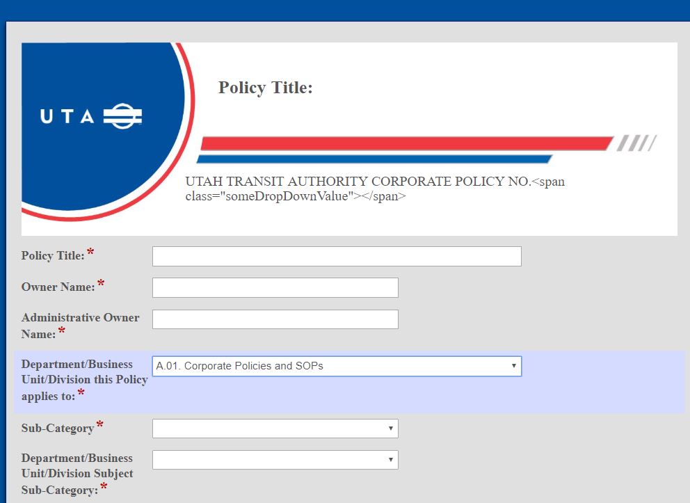 The issue is that I am saving the form to a location based on what they choose from that drop down. So for example, the location I would be saving this form would be A.01. Corporate Policies and SOPs. I want to retain this functionality while populating the UTAH TRANIST AUTHORITY CORPORATE POLICY NO. with just A.01 from the drop down. From my understanding with your method using javascript, the value of that drop down would change.