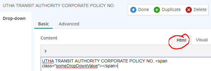 I tried the method you suggested, but when I save the form I only see "UTAH TRANSIT AUTHORITY CORPORATE POLICY NO.<span class="someDropDownValue"></span>". I cannot get that value to change. It may have to do with my "title" being a custom HTML element. I'm not actually using the title field.