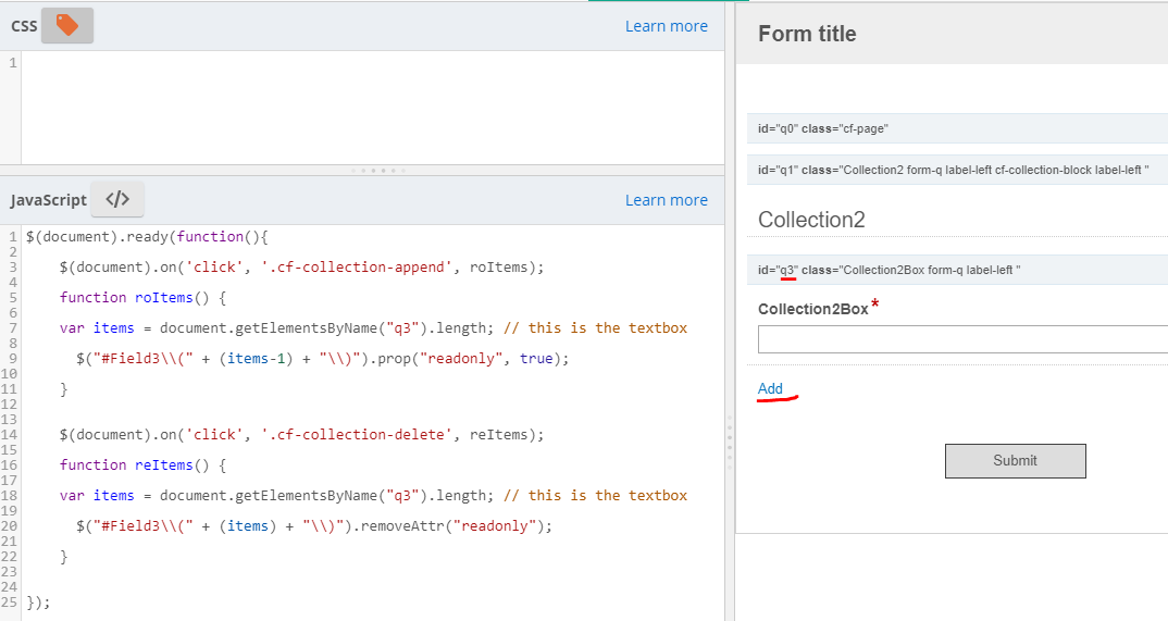 The second function also makes the previous field non-readonly in case you decide to remove an item from the collection.