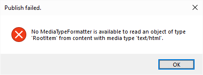 "No MediaTypeFormatter is available to read an object of type 'RootItem' from content with media type 'text/html'."