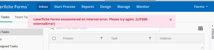My client recently installed forms on their server for the first time. Everything configured correctly but when they go to the tasks page after logging in they get a "Laserfiche Forms has encountered an internal error. please try again. [LFF500-InternalError]".