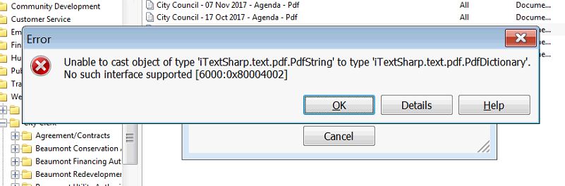 Error Message: Unable to cast object of type 'iTextSharp.text.pdf.PdfString' to type 'iTextSharp.text.pdf.PdfDictionary'.