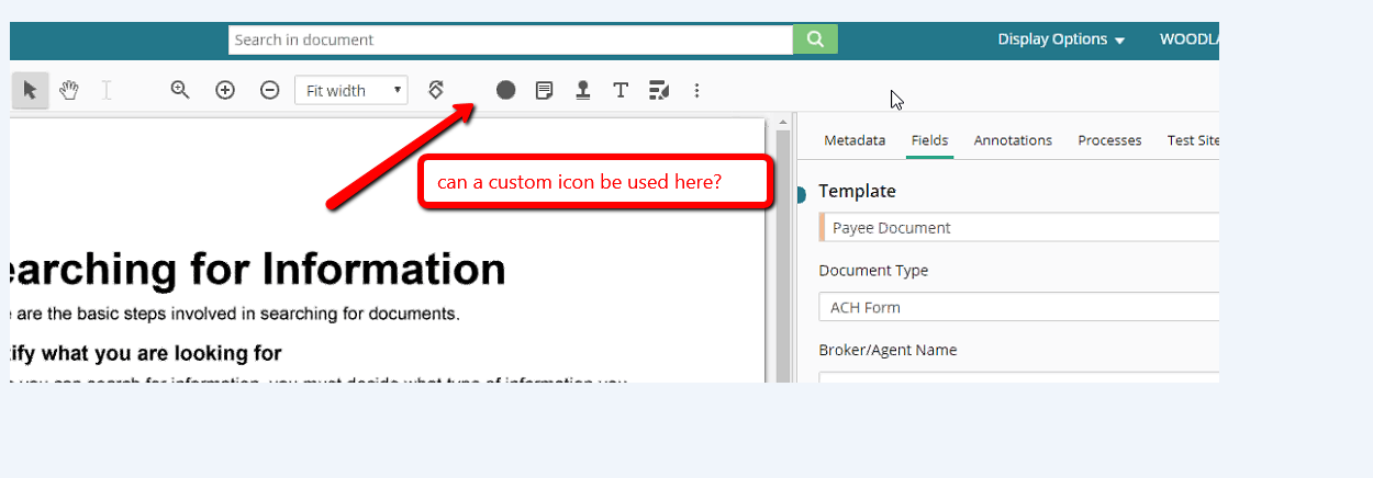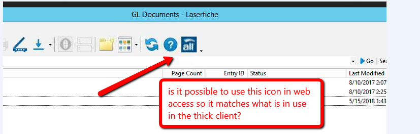 Can anyone tell me how custom tool icons can be changed in Web Access 10.2? I have 4 custom tools currently working in web access 10.2. The icon's for these 4 custom tools are showing the default custom actions icon which is just a colored circle and there is no way to tell which icon represents each of the custom tools. The first screenshot shows what the custom tool icon looks like now. The second screenshot shows how we want one of the custom tool icons to look. Setting custom icons for custom tools is easy in the LF Client but I have not been able to find the same options in web access. I understand that there may not be a built in tool or option for changing these icons but there has to be a way to do so by editing a .css file or .xml file somewhere. Can anyone give me some direction on how to set custom tool icons for Web Access 10.2?