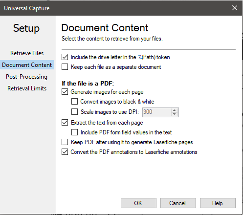 What options are you using under the 'Document Content' section of the scan source configuration?