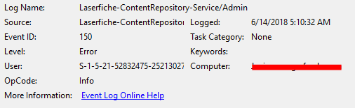 The description for Event ID 150 from source Laserfiche-ContentRepository-Service cannot be found. Either the component that raises this event is not installed on your local computer or the installation is corrupted. You can install or repair the component on the local computer.