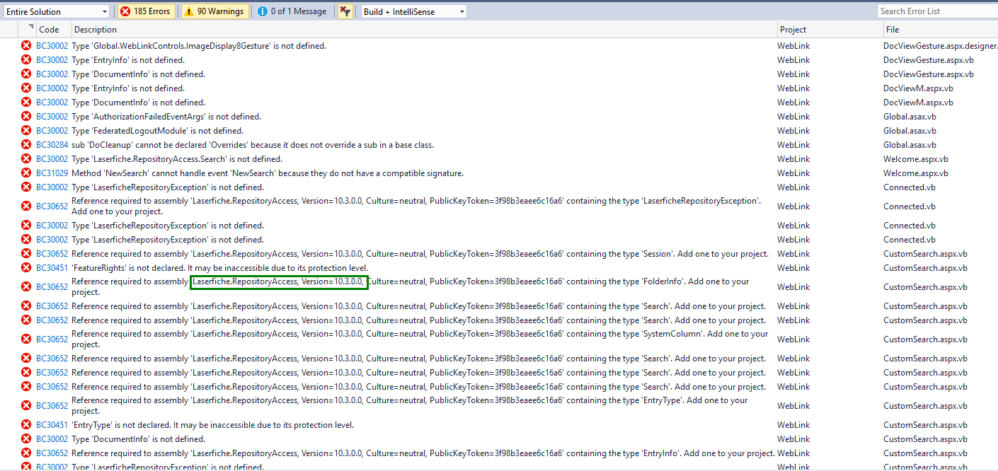 That seemed to work but I have a ton of other errors now but they seem to be due to a missing reference for Laserfiche.RepositoryAccess as you can see in the image below. Where can I get the Laserfiche.RepositoryAccess Version 10.3.0.0 assembly?