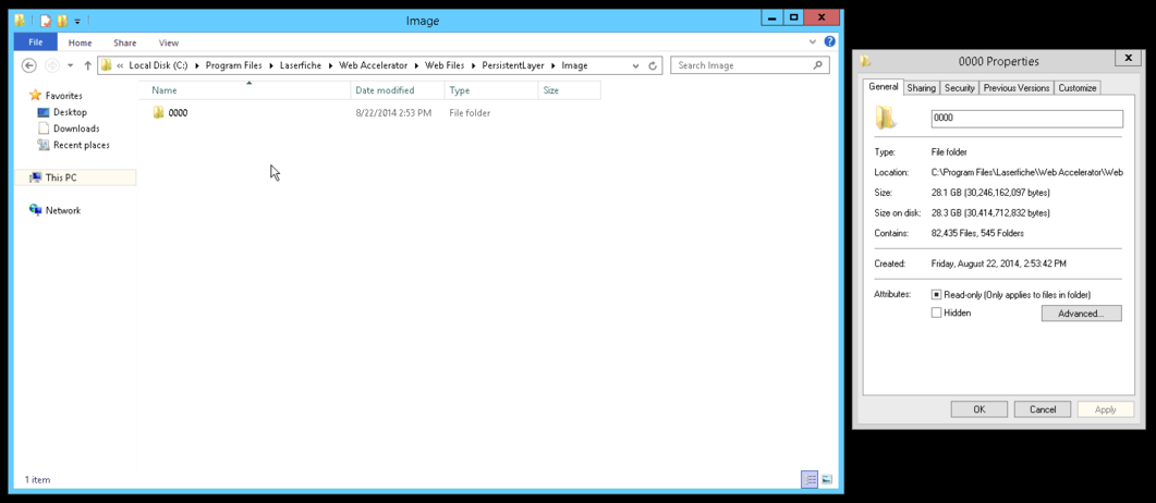 We have a client that is noticing that a folder from Web Accelerator is using quite a bit of their storage on their server. Currently, the folder "c:\program files\laserfiche\web accelerator\web files\persistentlayer\image" is using 28.3GB. (See screenshot below.)