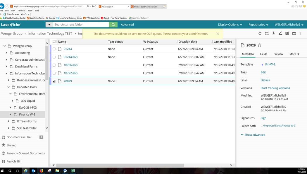 I am trying to OCR tiffs that didn't OCR when they came in via Quickfields. The number of documents isn't that many (under 100) and I chose to do this from the Web Client. When I choose Generate Pages from the menu options, it goes through letting me choose pages to OCR, and then returns the error "The documents could not be sent to the OCR queue. Please contact your administrator."