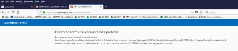 In Forms 10.21.1.246 if I create a single line field that I want in a MM/YYYY format and use the following regex to validate it: ^((0[1-9])|(1[0-2]))\/((19[0-9][0-9])|(20[0-3][0-9]))$ I get this error after I submit. If I change the regex to us a dash - instead of a forward slash / it fixes it ^((0[1-9])|(1[0-2]))\-((19[0-9][0-9])|(20[0-3][0-9]))$ Is this a bug? If so what work arounds might you suggest? Anything helps. And is it fixed in 10.3?