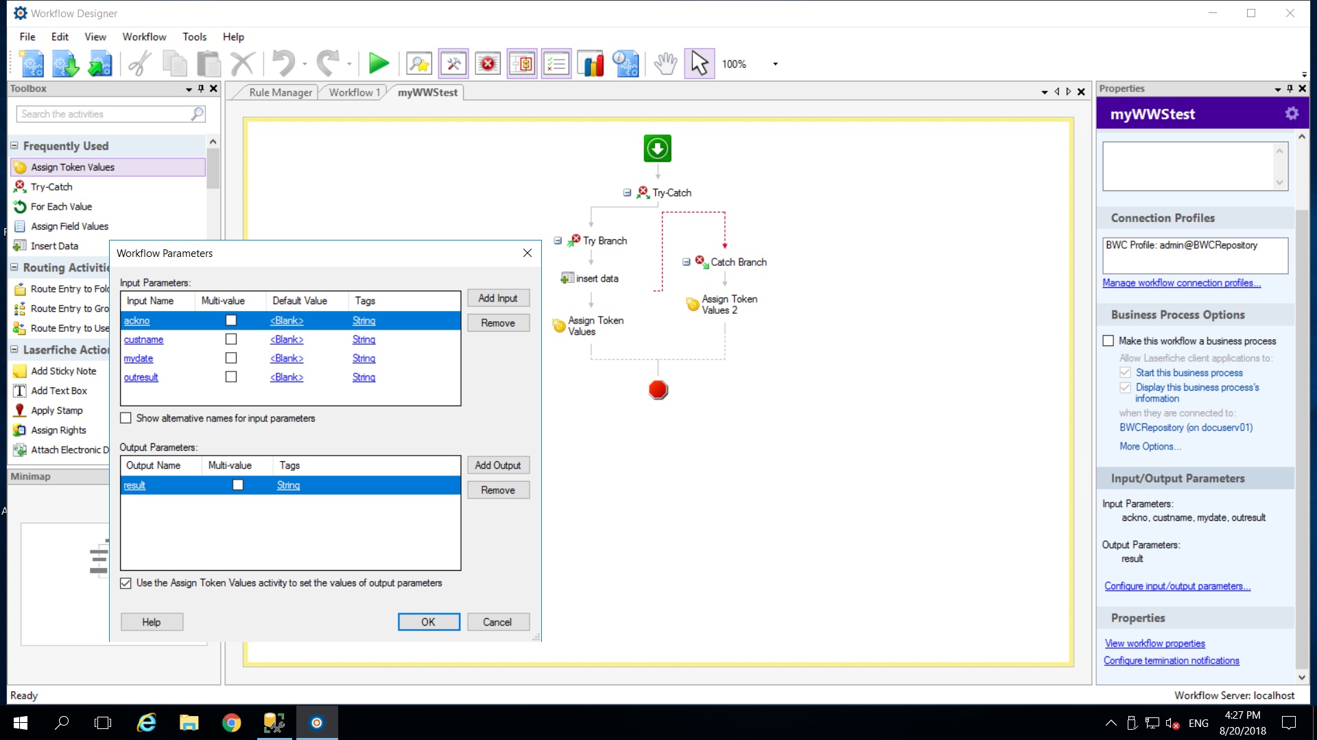 The purpose to get the output parameters: "result" is ensure the workflow runs complete successfully without error and send back a parameter "result" to my C# program with result=0 (success); result=1 (fail).
