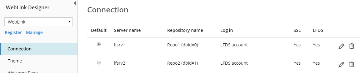 WebLink allows access to both repositories by manually changing the URL parameters. (e.g. https://lfsrv.domain.com/WebLink/Welcome.aspx?repo=Repo1&dbid=0 and https://lfsrv.domain.com/WebLink/Welcome.aspx?repo=Repo2&dbid=1).