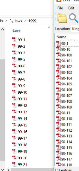 Windows Explorer has some special-case handling for filenames that appear to be numeric, which Laserfiche does not support. The standard solution is to pad numbers with preceding zeroes, which will cause "90-011" to appear before "90-100".