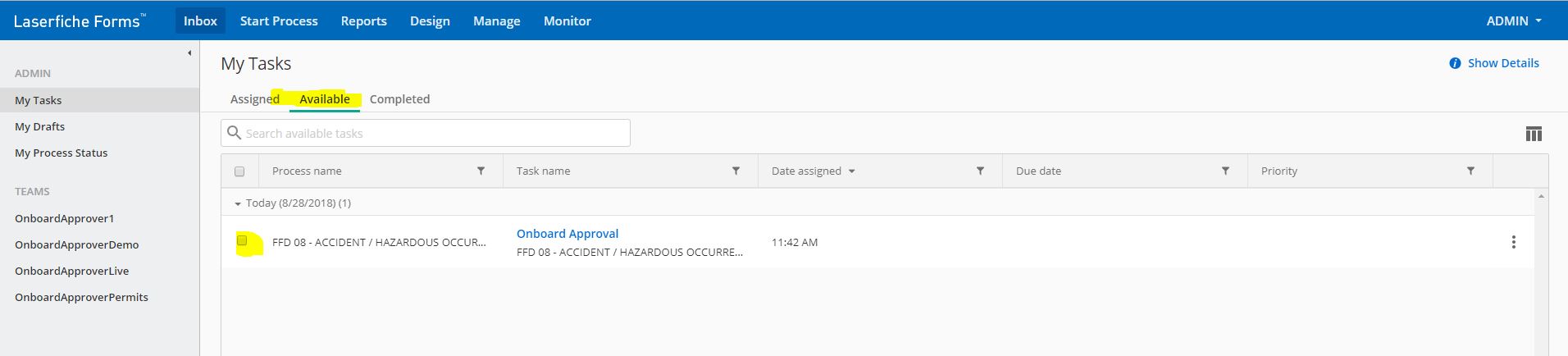 We have a form that is shared by a team and therefore is waiting under the 'Available' list in the forms 'Inbox'. However I have noticed that in one experience via Internet Explorer I have a VERY handy number 1 notification allowing me to see their is a task waiting for me to complete...