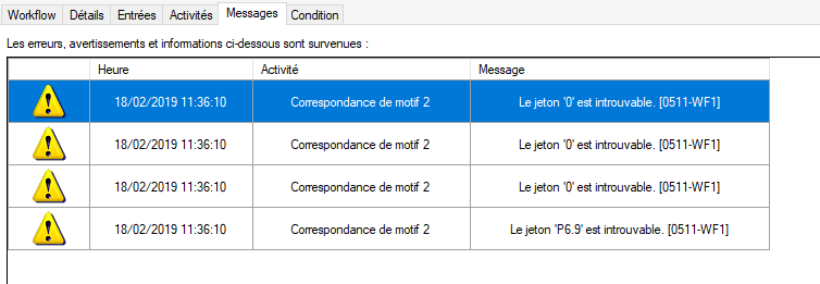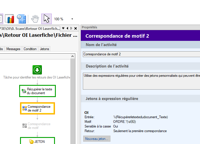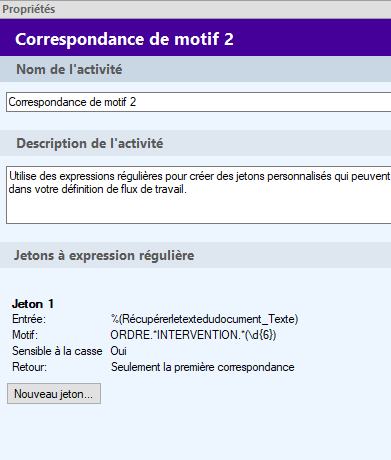 Can we get a screenshot of the properties of the Pattern Matching activity ("Correspondence de motif 2") from the instance details?