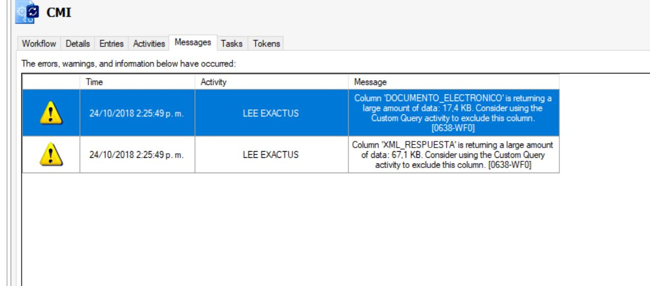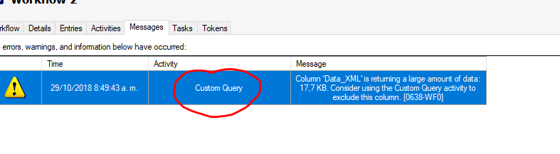 We need to read from a SQL table a value that exceeds 100 characters. By including the Query Data activity in the workflow and trying to read that column, we get the error: "Colum ELECTRONIC DOCUMENT is returning to a large amount of data Consider using the Custom Quey activity to exclude this colum [0638-WF0]"