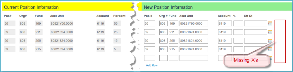 Newbie here. I'm creating a form for Position account changes. The left table (Current Pos. class="CurPos") is read-only and has the form-del-field and form-add-row buttons disabled. The New Position table (class="NewPos") has the same data copied to it so the users can make changes there by either changing the funding source or adding/deleting rows. Only the New Pos. data would flow to the next event.