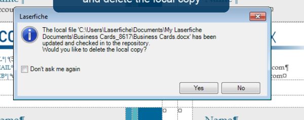 When I first started using Laserfiche, I made the mistake of clicking the "Don't ask me again" option on the below image, and then clicked "No". Unfortunately, now I have every single file that I open from Laserfiche saved in "My Laserfiche Docs" and I have to go back and delete them every now and then (and I probably open about 20 or so documents in a day). This is inconvenient, because sometimes I have a file checked out that I want to leave checked out for a few days. I have Googled this and searched it on this forum, but cannot figure out how to change it (or at least get that box to come up again). Thanks in advance for any help.