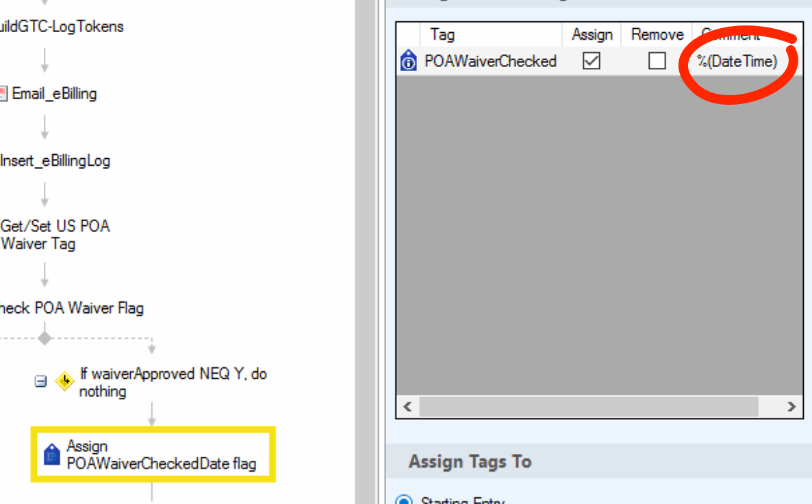 I am modifying an existing workflow, adding a conditional tag - when the tag is added I would like to have the comments of the added tag show the DateTime, this seems trivial and appears to be supported in the workflow designer however my tags are not getting the DateTime comment.