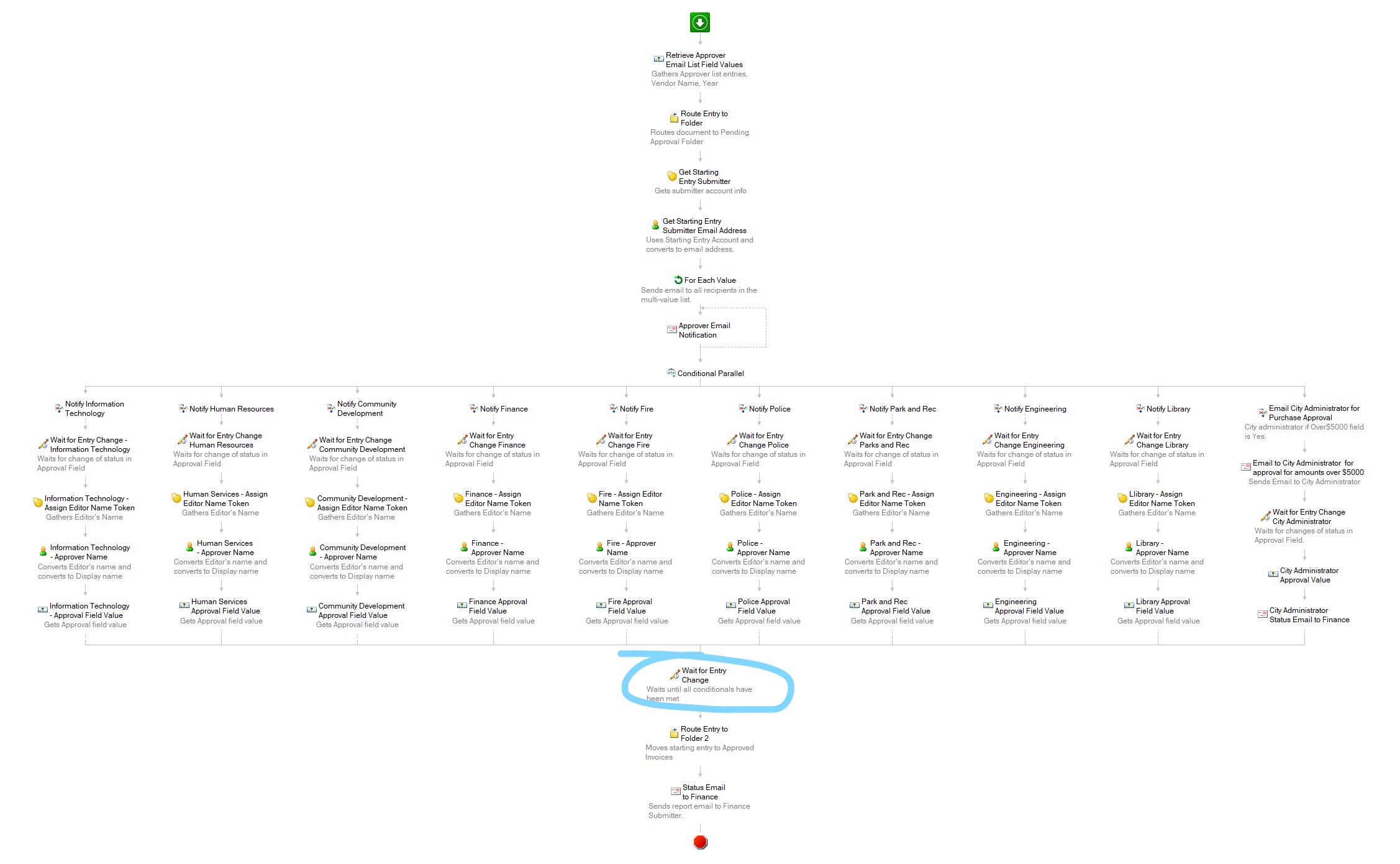 I have attached a screenshot of the workflow I have completed up to this point but I’m stuck on wait for entry change that has to somehow check to make sure the original selected approvers have approved or declined their portion of the document.