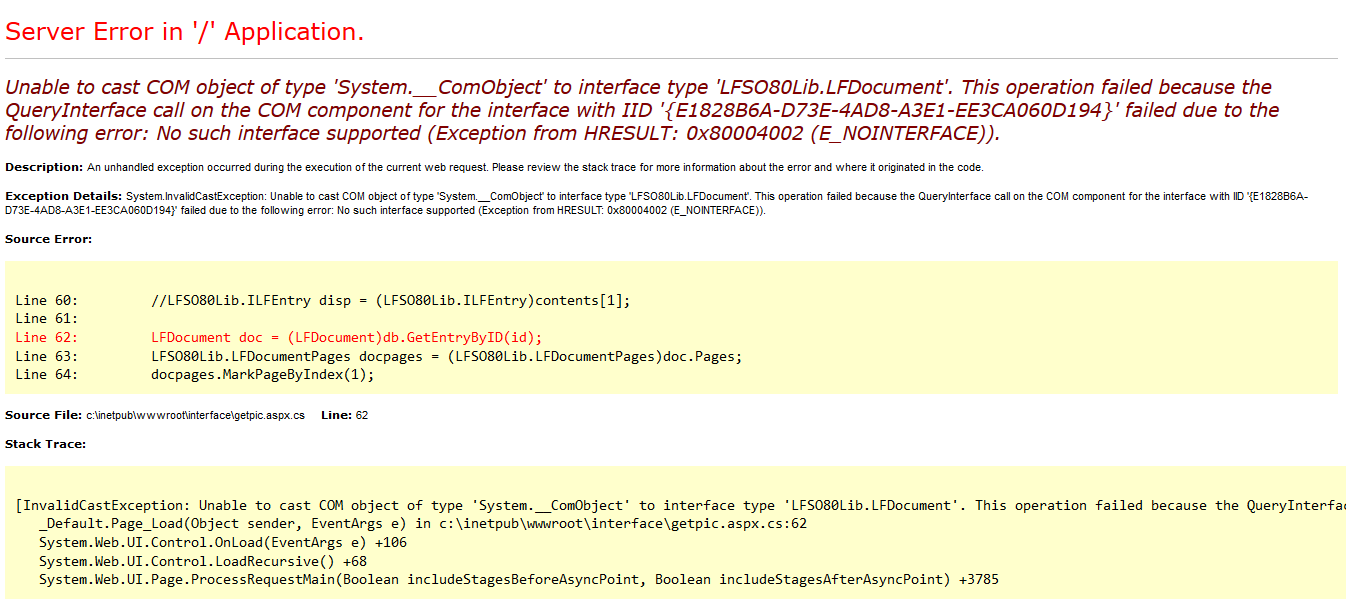 Unable to cast COM object of type 'System.__ComObject' to interface type 'LFSO80Lib.LFDocument'. This operation failed because the QueryInterface call on the COM component for the interface with IID '{E1828B6A-D73E-4AD8-A3E1-EE3CA060D194}' failed due to the following error: No such interface supported (Exception from HRESULT: 0x80004002 (E_NOINTERFACE)).