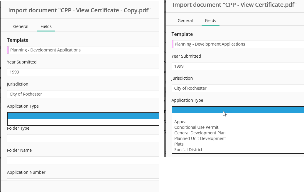 The first file of every day works fine. They can pick all the fields. See the right side of the screenshot. Every single file after that they try to put the metadata on and the fields stall out at Application Type. See the left side of the screenshot.
