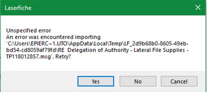 I have a user recently upgraded to Windows 10 and now they are unable to drag and drop from Outlook into folders on Laserfiche. They get the following error, I am wondering if this is a Laserfiche or Windows error.