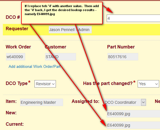 To get the 'New' and 'Current' fields to populate from the lookup, we have to manually change the value from the DCO # field and type it in again to get the lookup to display results.