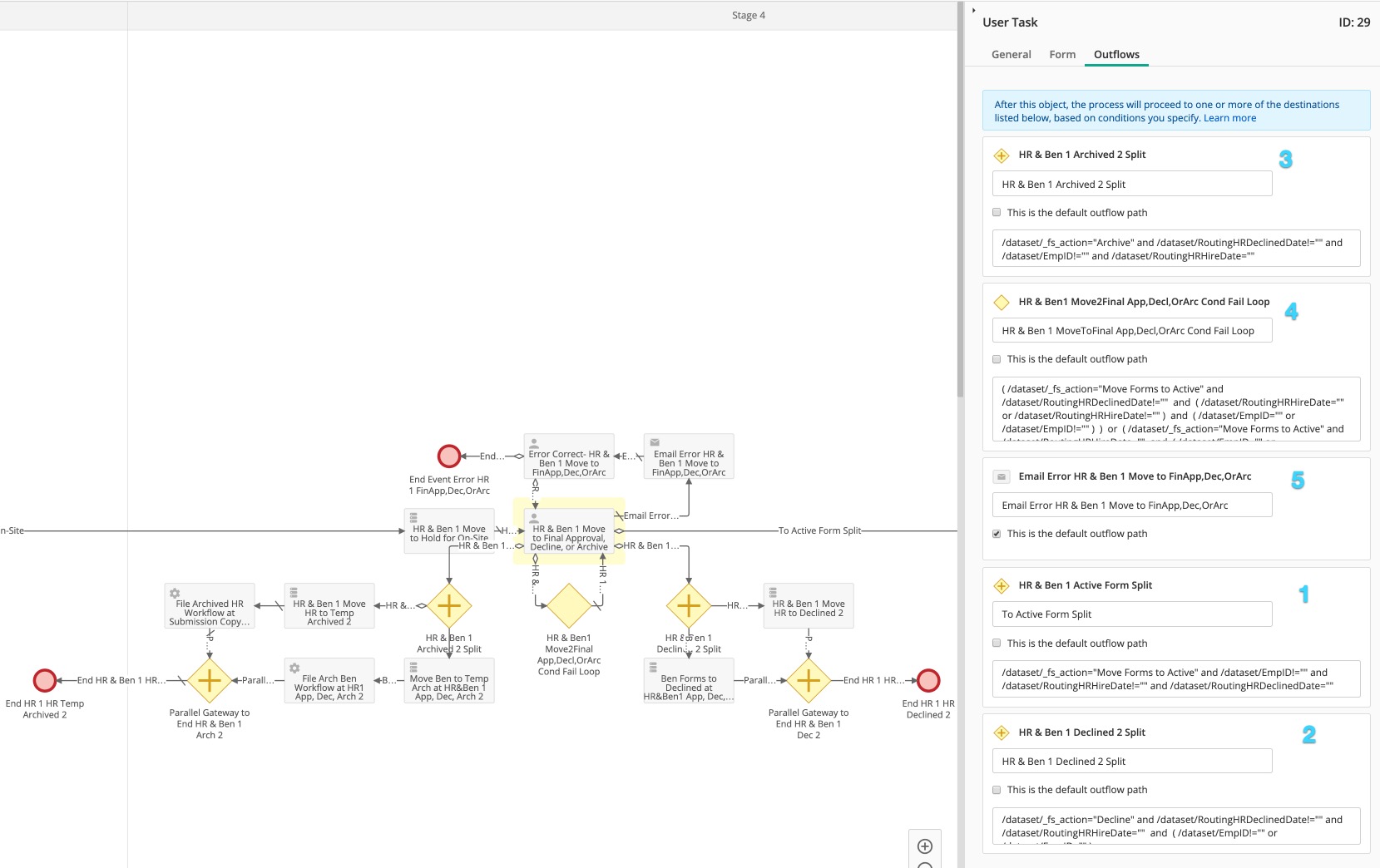 Is anyone else having issues with User Tasks in Forms 10.* suddenly appearing out of order even though they were built and attached in a certain order? I built the tasks in the attached screenshot in the order of the blue numbers in the right side of each Outflow, with one being the first task and five, a default path if all other paths fail, as the last task. The tasks are now completely out of order.