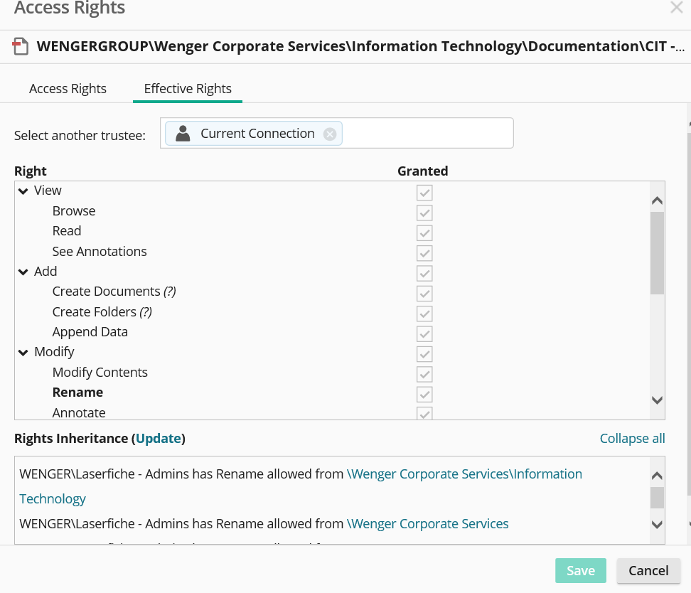 We have a folder where documents are copied to so that users have rights to edit/modify them. Some of these documents are not showing with the Rename effective right although the logged in user is an Admin who has this right. What would prevent that user from renaming the document?