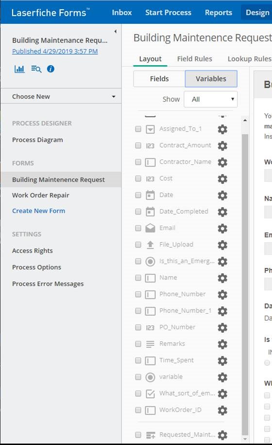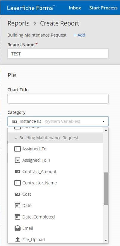 I am trying to create a bar graph or pie chart report grouping our Building Maintenance Requests by locations. However, it seems that because the variables that are part of a Collection, they do not show up as options to select in any of the report except a Table report. And even when I create a Table report, it does not allow me to sort by any of the variable fields that are part of the Collection. Is my only option to go back to my form and separate out each of the variable fields from the Collection or am I missing something else?! I attached screenshots for reference. I have watched SEVERAL tutorial videos about reports and read through the Laserfiche Administration Guide but nothing I find covers this specifically. Any advice would be appreciated!