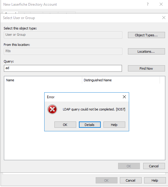 I am trying to add Laserfiche Directory Users to the Laserfiche Administration Console, the locations available to me are 'lfds' although after inputting a user query i get the following error as the LFDS server is on another computer.. I have STS setup successfully and can authenticate into forms etc although cannot add users from the LFDS to the repository to assign rights. How would I add a new location to the add directory users? I am running the latest version of Laserfiche 10.4,