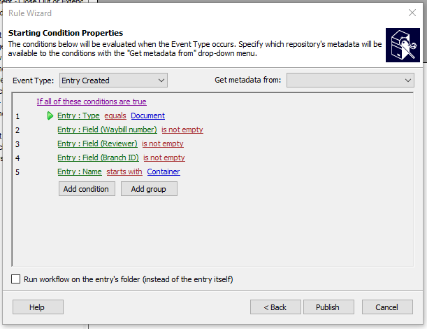 To do this last step, we have designed a workflow in Workflow designer, when the starting rule targets the document (by using the conditions in the screenshot attached). I have also attached a screenshot of the worflow.