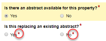 The way I want my process to work is that if the "Is there an abstract available for this property?" is answered yes then the question "Is this replacing an existing abstract?" needs to be required.