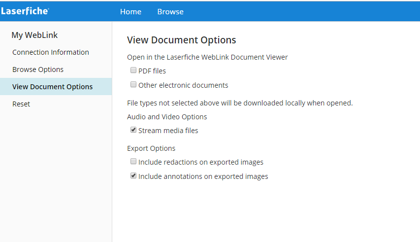 In the Open in the Laserfiche WebLink Document Viewer section, you can specify whether to open PDF files and other electronic document types in the Document Viewer. If you select this option and the electronic documents have image pages, the image pages will be displayed in the Document Viewer. If they do not, PDFs will display in the Document Viewer; other electronic files will display their metadata and text but not the file itself. If this option is cleared, the PDFs or other electronic document types will download, to be opened in their native application.