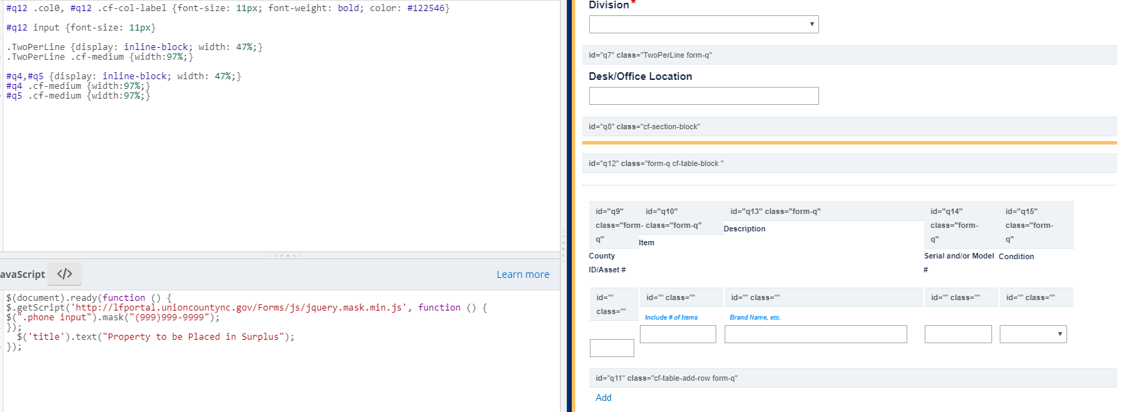 where q7 was the id of the table. This did not work using the id of the column (which in Laserfiche Forms is implemented as a <td> element.