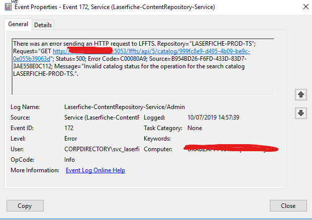 There was an error sending an HTTP request to LFFTS. Repository="LASERFICHE-PROD-TS"; Request="GET http://{server}:5053/lffts/api/5/catalog/999fc8e9-d495-4b09-be9c-0e055b39063d"; Status=500; Error Code=C00080A9; Source=B954BD26-F6FD-433D-83D7-3AE558E0C112; Message="Invalid catalog status for the operation for the search catalog LASERFICHE-PROD-TS.".