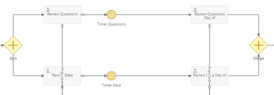 The above process would have two different tasks per appointment in the waiting area. To change the schedule, you'd have to change the questions waiting task and the data waiting task. If those are two different days, that may work. Otherwise, you could consider the process below. After both the Review Questions and Review Data tasks are complete, the branches merge and go into a single holding task. You could update the appointment as many times as you'd like in the holding team, then a day before the appointment, the same to review tasks would be started.