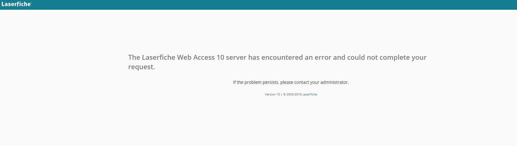 One of our users is cannot log into Laserfiche web. When they put in their credentials it loads for 2 minutes, then says "The Laserfiche Web Access 10 server has encountered an error and could not complete the request." We tried her account on a different computer, and got the same error. Everyone else can still log in just fine. This user can also log-in to the windows client no problem. We deleted her license, and added it back and then we were able to log in once, but then it gave us this error again later.