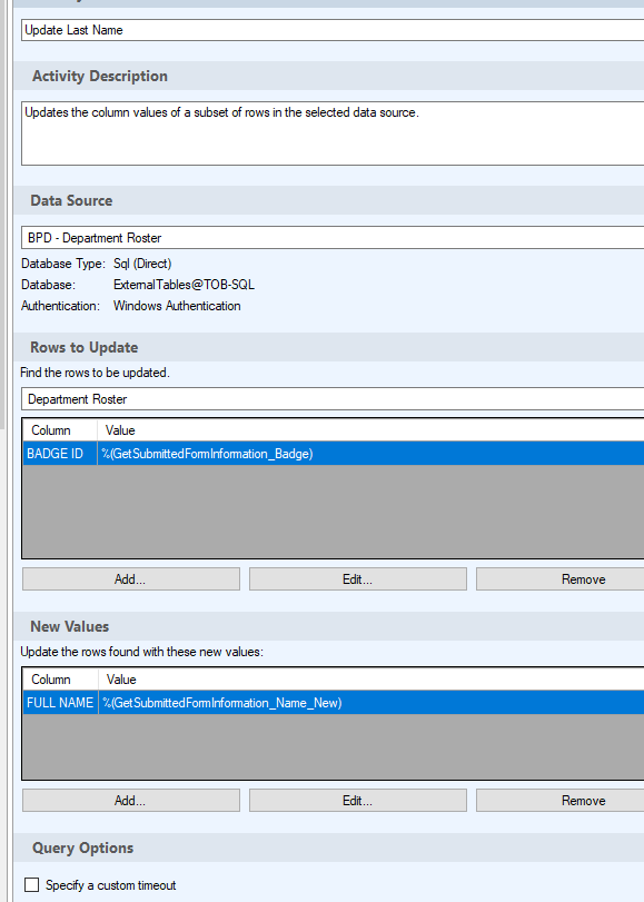 So now I want to have workflow query the table (on a weekly schedule) and return all employees values on a word doc table by row. Plan on having workflow email staff when any change is made to the roster. Just not sure how to query the information to use in a table merge in word.