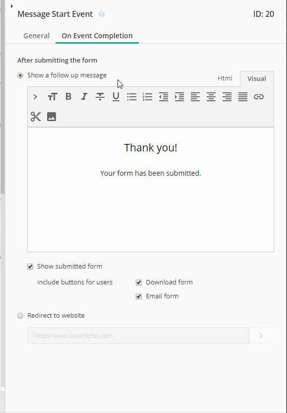 Does anyone know if it is possible to change the Thank You message received by someone who submits a form via URL? We will be placing a form on our website for customers to submit and was hoping to have a message for the customer instead of the Laserfiche generic Thank You message.