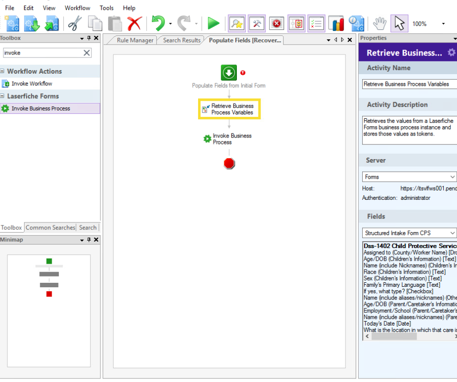 So I figured out the Server section for Retrieve Business Process Variables, but now that we've found our variables and turned them into tokens, how do we put them into the other form..? Is that under the Invoke Business Process somehow?