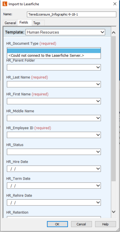 Could not connect to the Laserfiche Server. Dynamic Fields