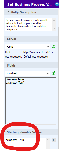We have set the parameter= 789, but this does not put that value back into the form? In forms, this design gets stuck on the workflow, although the workflow shows everything to have been completed.